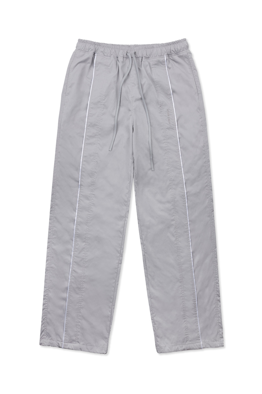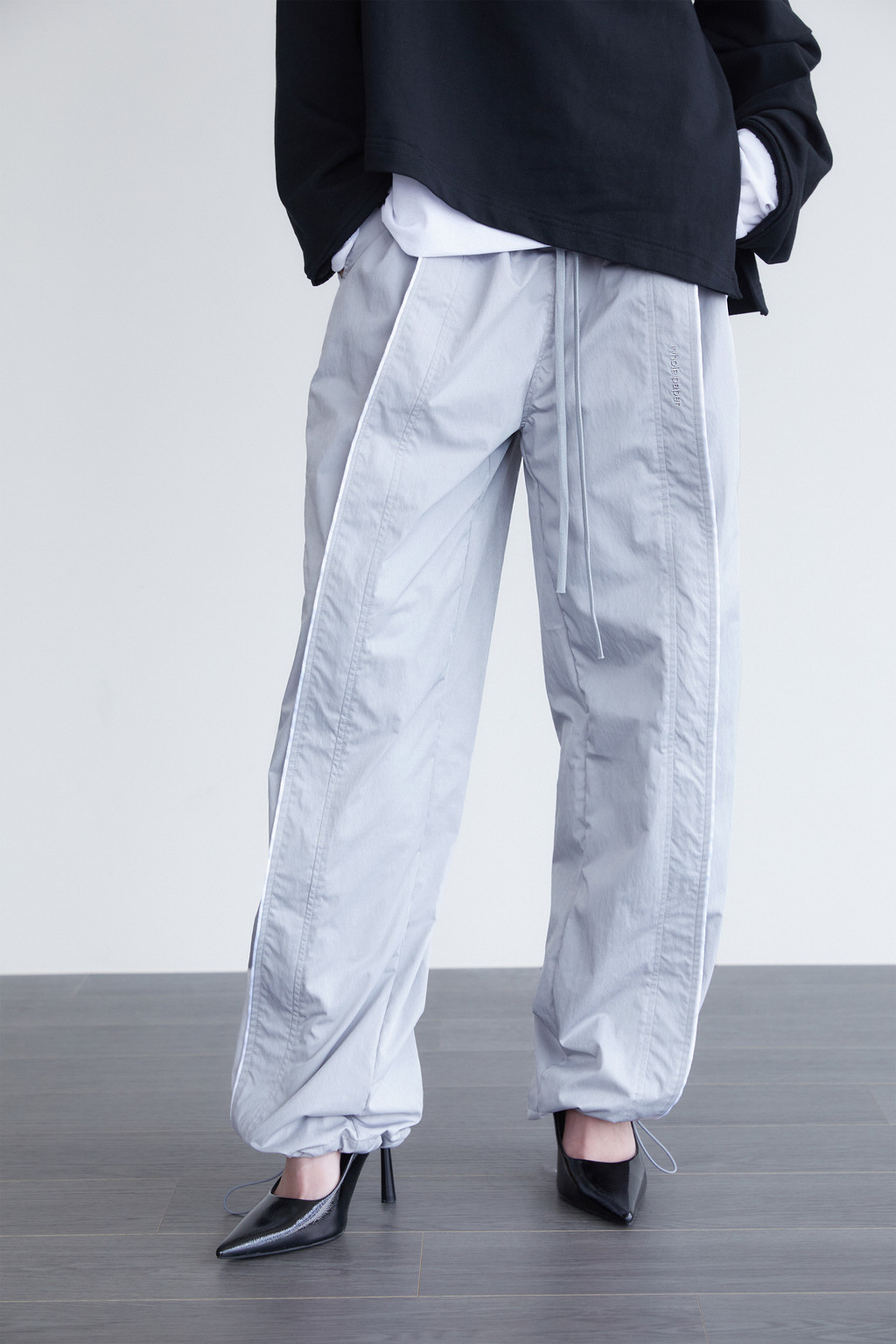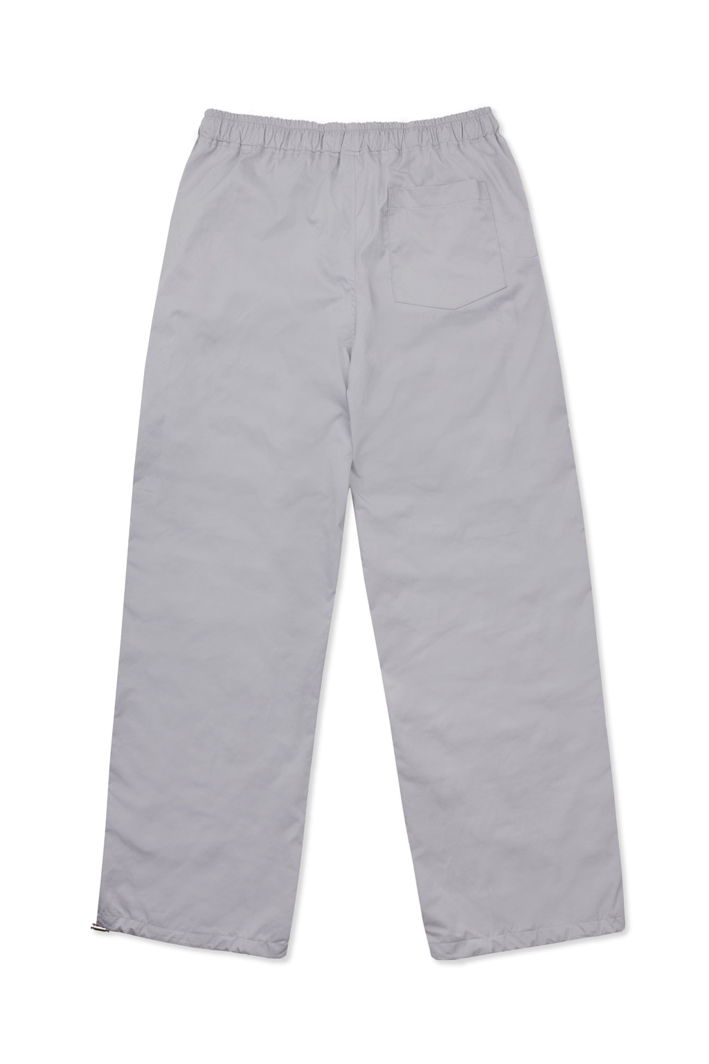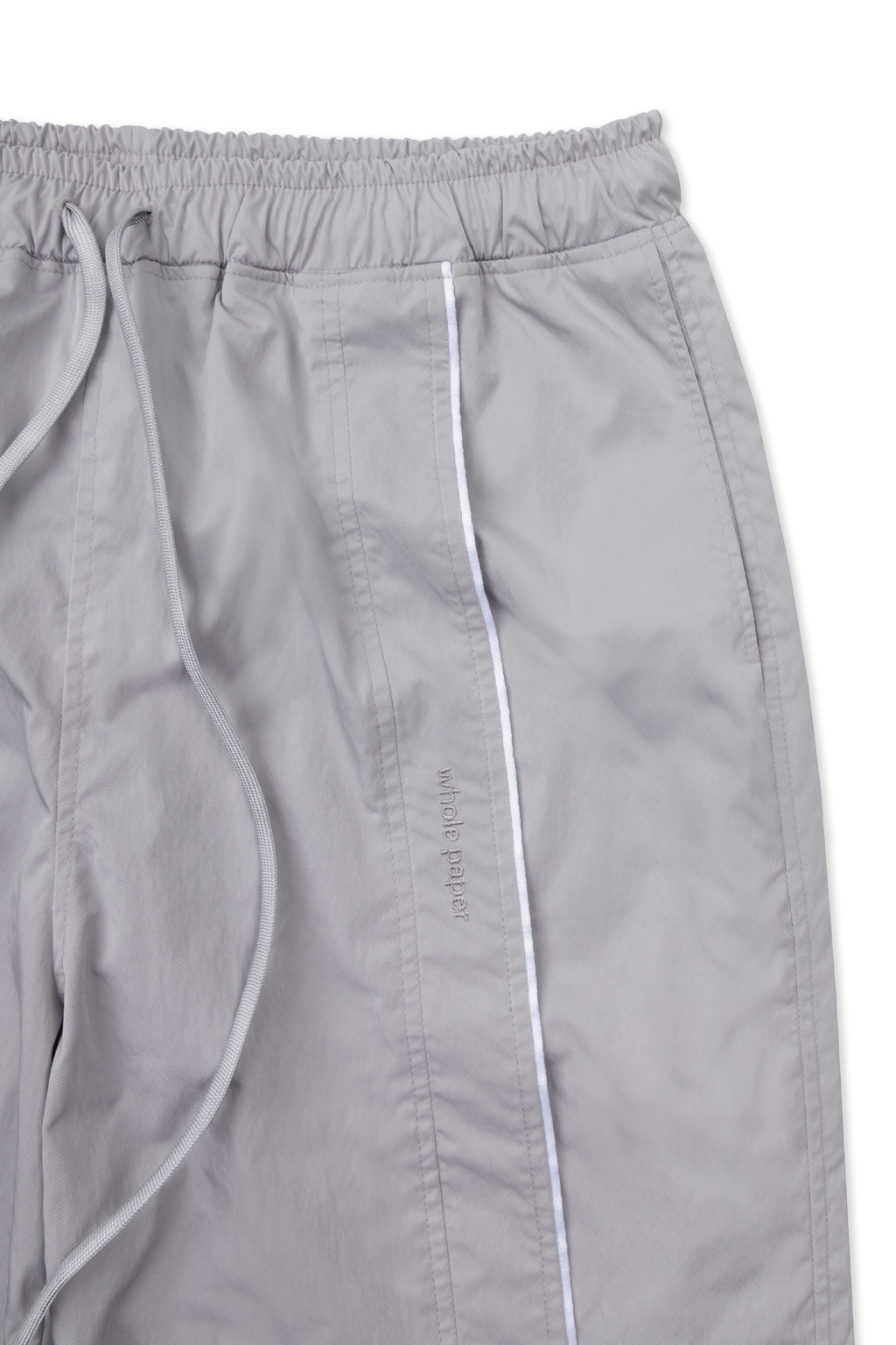 은은한 광감이 도는 나일론 트랙 팬츠입니다. 폴리에스터가 함유되어 뻣뻣하지 않고 유연한 느낌을 느낄 수 있습니다. 오버사이즈 이지만 슬림한 핏감을 연출하며 넓은 핀턱 포인트에 흰색 라인 디테일과 홀페이퍼 로고 자수 디테일이 포인트인 제품입니다.허리 밴딩과 허리 스트링으로 사이즈 조절이 가능하고 편안한 착용감을 제공하며 밑단 스트링으로 다양한 핏으로 착용 할 수 있습니다. 내부 메쉬 안감이 있어 정전기를 예방할 수 있으며 어느정도의 보온성을 제공합니다. 양 사이드 포켓과 힙 포켓으로 실용성을 더했습니다.