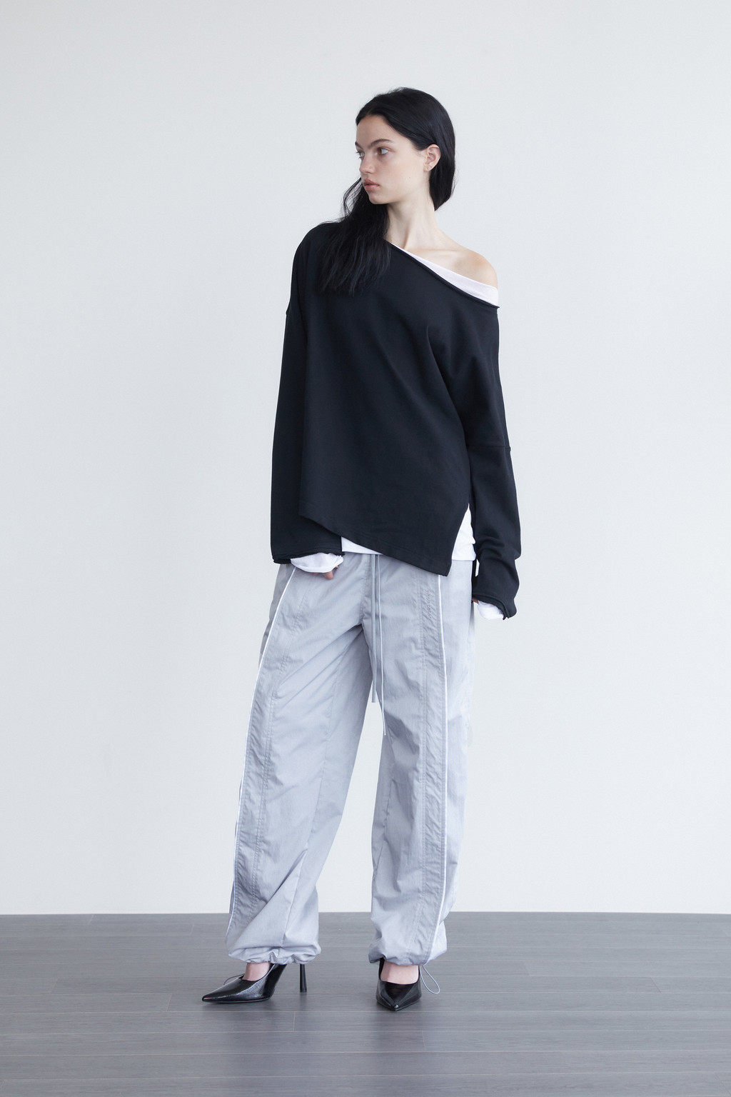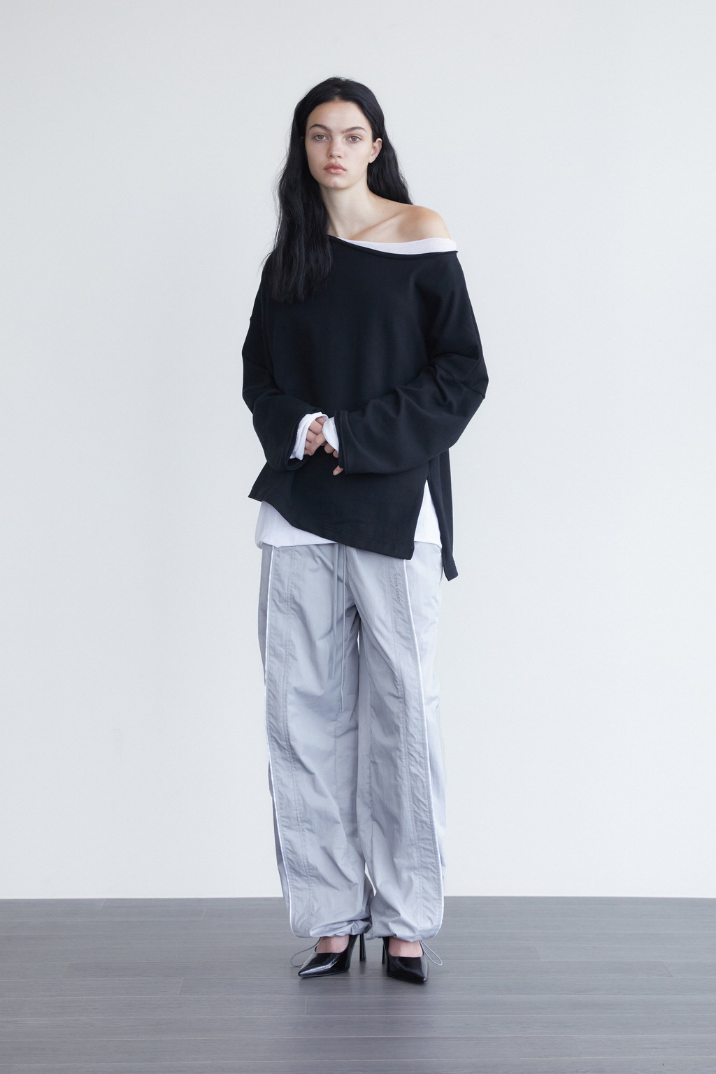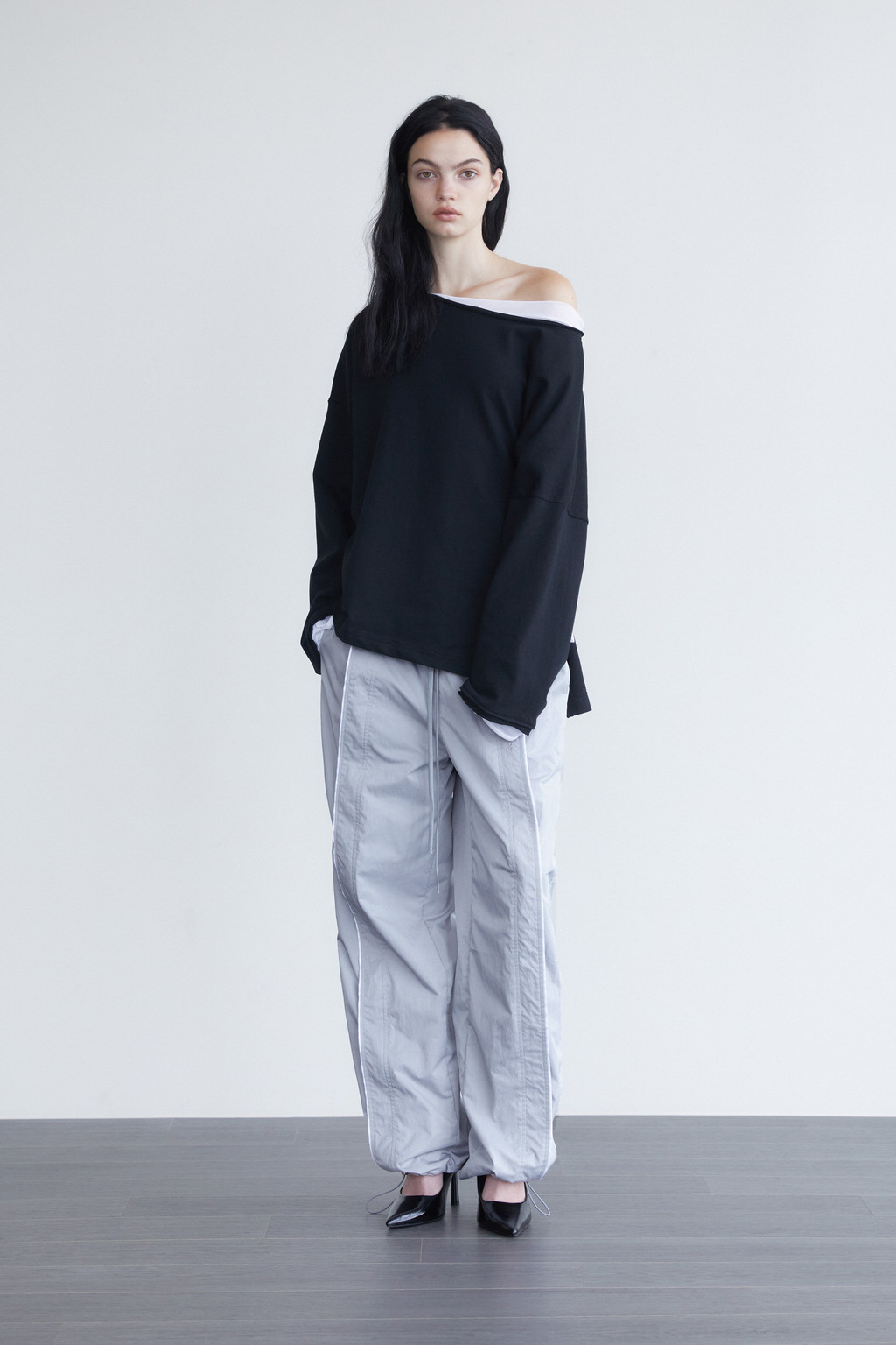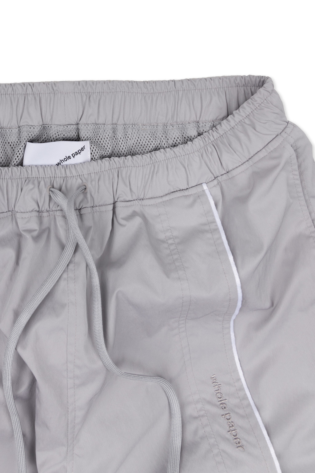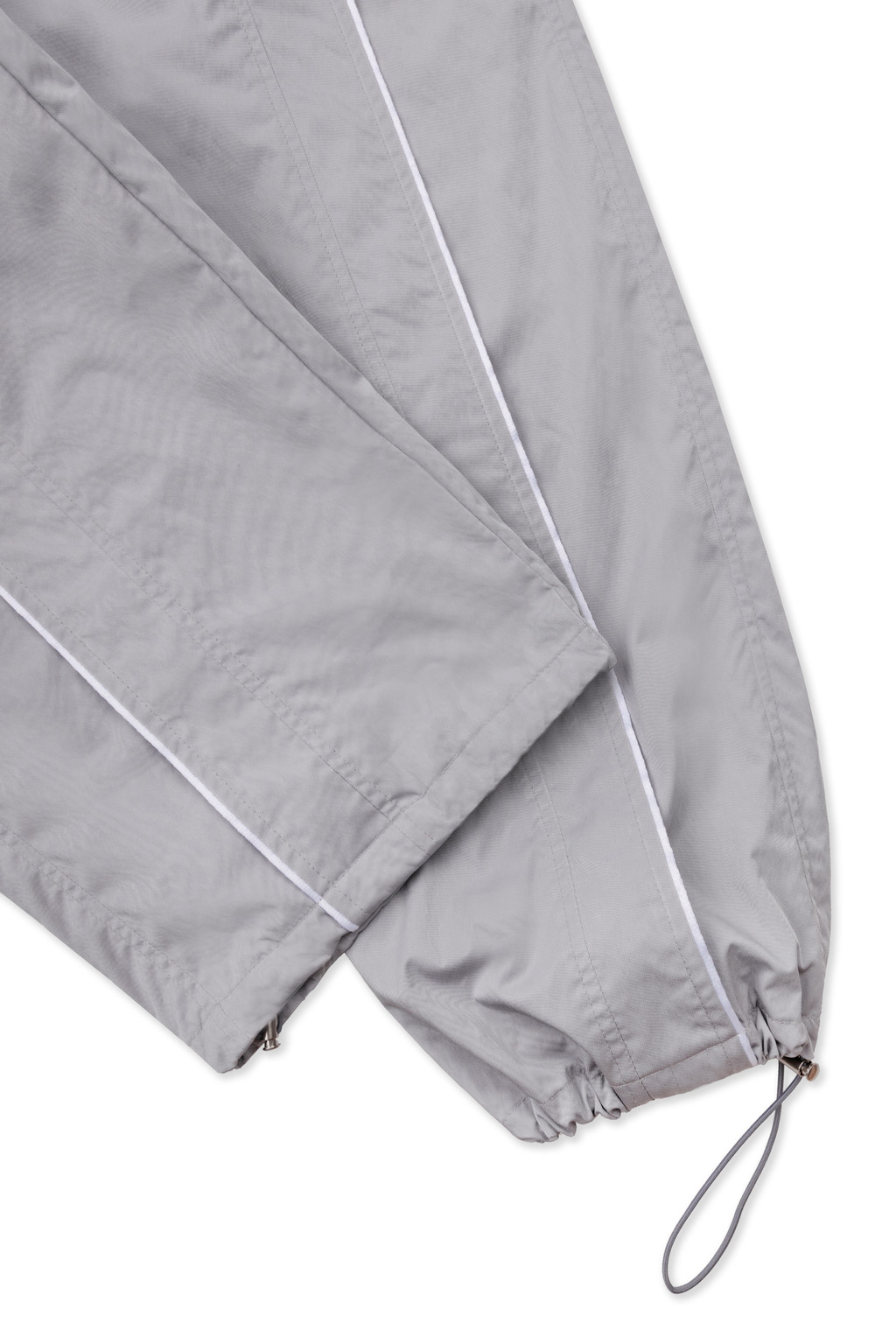 은은한 광감이 도는 나일론 트랙 팬츠입니다. 폴리에스터가 함유되어 뻣뻣하지 않고 유연한 느낌을 느낄 수 있습니다. 오버사이즈 이지만 슬림한 핏감을 연출하며 넓은 핀턱 포인트에 흰색 라인 디테일과 홀페이퍼 로고 자수 디테일이 포인트인 제품입니다.허리 밴딩과 허리 스트링으로 사이즈 조절이 가능하고 편안한 착용감을 제공하며 밑단 스트링으로 다양한 핏으로 착용 할 수 있습니다. 내부 메쉬 안감이 있어 정전기를 예방할 수 있으며 어느정도의 보온성을 제공합니다. 양 사이드 포켓과 힙 포켓으로 실용성을 더했습니다.