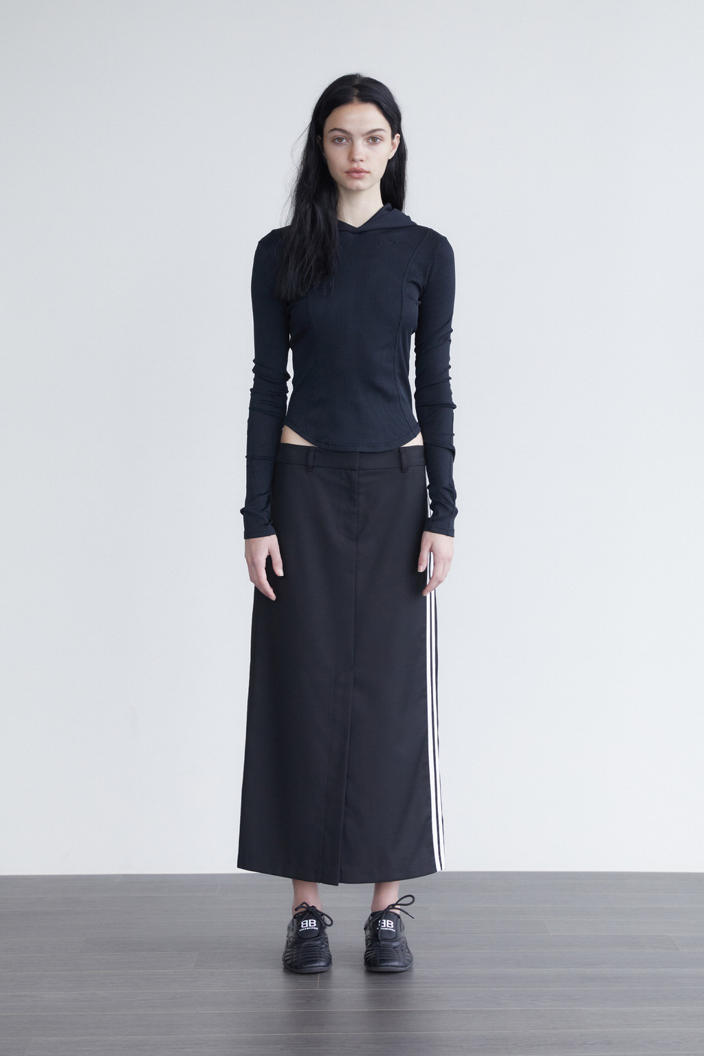 은은한 광감이 있는 탄탄한 정장 원단으로 제작된 롱 스커트입니다. 로우 라이즈로 스커트로 골반에 툭 걸쳐 입는 핏감을 연출할 수 있으며 좌측 사이드에 투 라인 포인트로 스포티한 무드를 제공합니다. 데일리한 블랙컬러로 스타일링하기 좋은 아이템이며 양 사이드 및 뒷면에 포켓으로 실용성을 높였고 앞 트임으로 활동이 편안합니다.