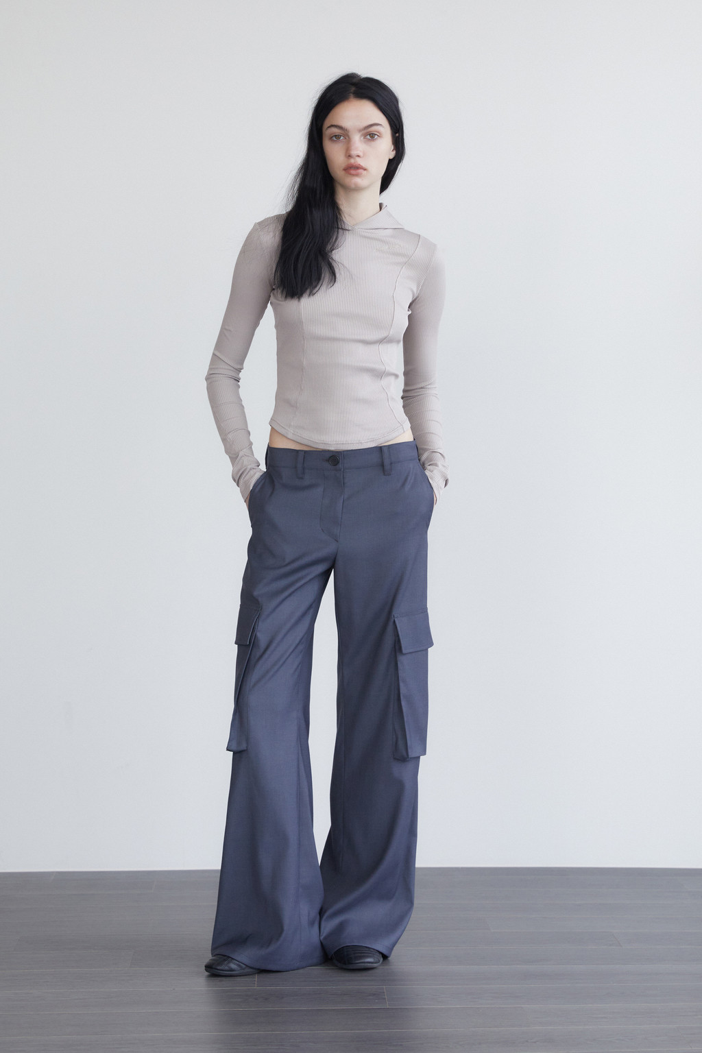 실키한 정장 원단으로 제작된 정장 카고 바지입니다. 로우라이즈로 밑위가 짧으며 골반에 툭 걸쳐입는 핏감과 롱한 기장감에 약간의 플레어 실루엣으로 다리가 슬림하고 길어보이는 핏감을 제공합니다. 양 사이드에 입체 빅 포켓으로 캐쥬얼한 무드를 느낄 수 있습니다