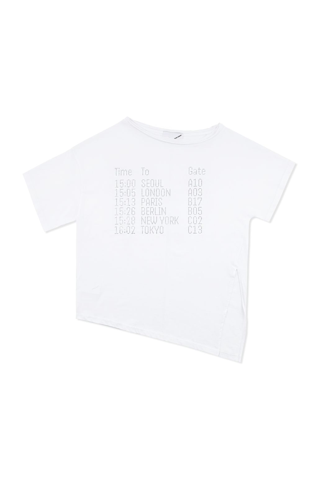 언발란스한 오프숄더 반팔 탑으로 양쪽 오프숄더로 자유롭게 연출이 가능합니다. 바이오 워싱, 실켓가공이 된 원단을 사용하여 표면이 실키하고 부드러우며, 적당한 탄탄함과 시원함을 동시에 제공합니다. 공항 전광판에서 영감을 얻은 디파쳐 그래픽으로 큐빅 포인트를 더했으며 네크 라인, 소매 끝 등 러프 마감으로 빈티지한 무드를 느낄 수 있습니다. 이번 시즌 리뉴얼 된 언발란스 탑은 옆 선 트임을 묶어 스타일링 할 수 있도록 디자인 되어 활용도를 높였습니다.