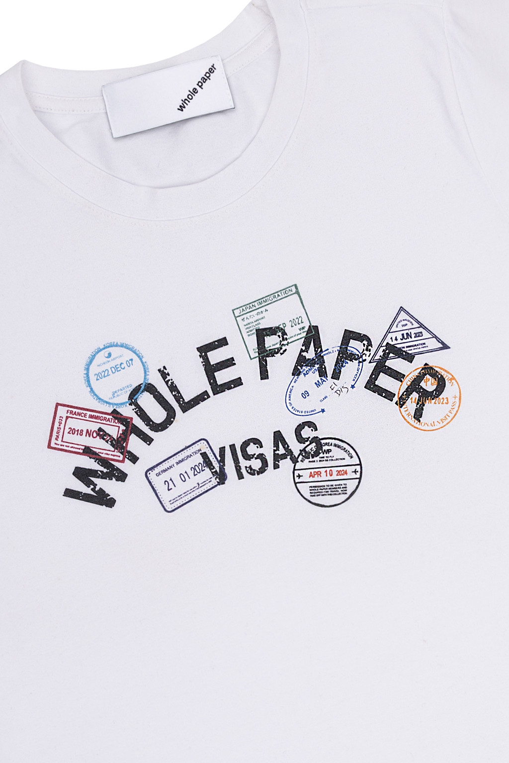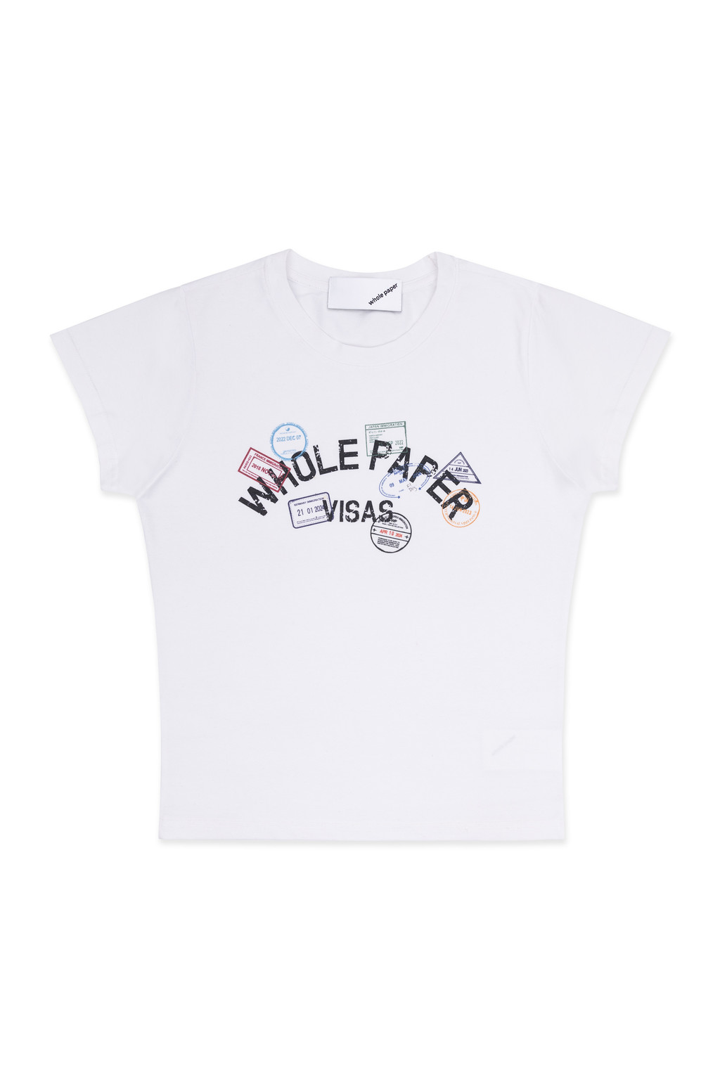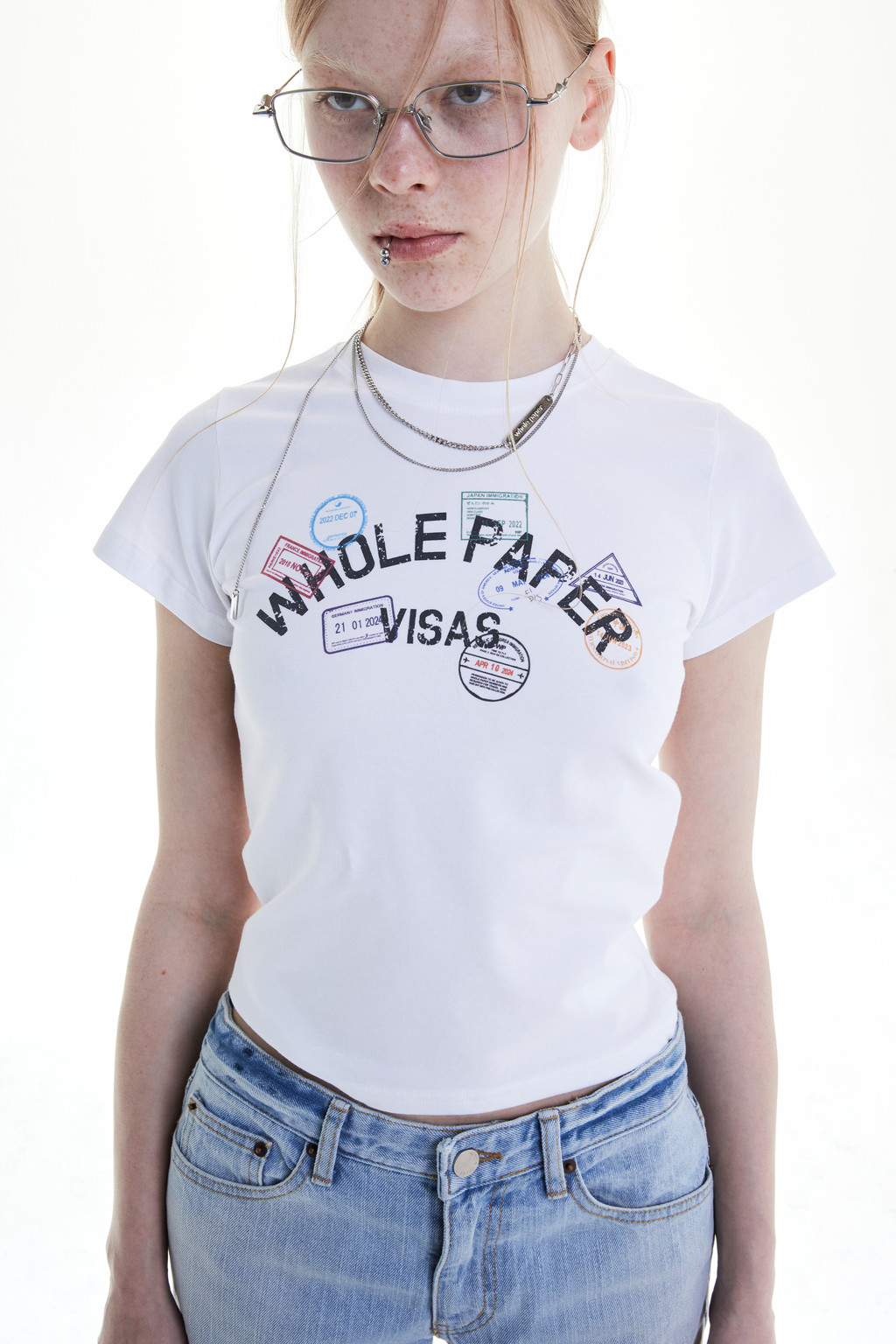 입국심사 비자 스탬프를 모티프로 디자인한 그래픽 타이트 티셔츠입니다. 각 나라의 도장을 연출하여 재미와 빈티지한 무드를 느낄 수 있습니다. 짱짱하고 신축성 좋은 면 스판 원단으로 편안한 착용감과 실켓 처리된 원단으로 시원하고 부드러운 텍스처를 느낄 수 있습니다.