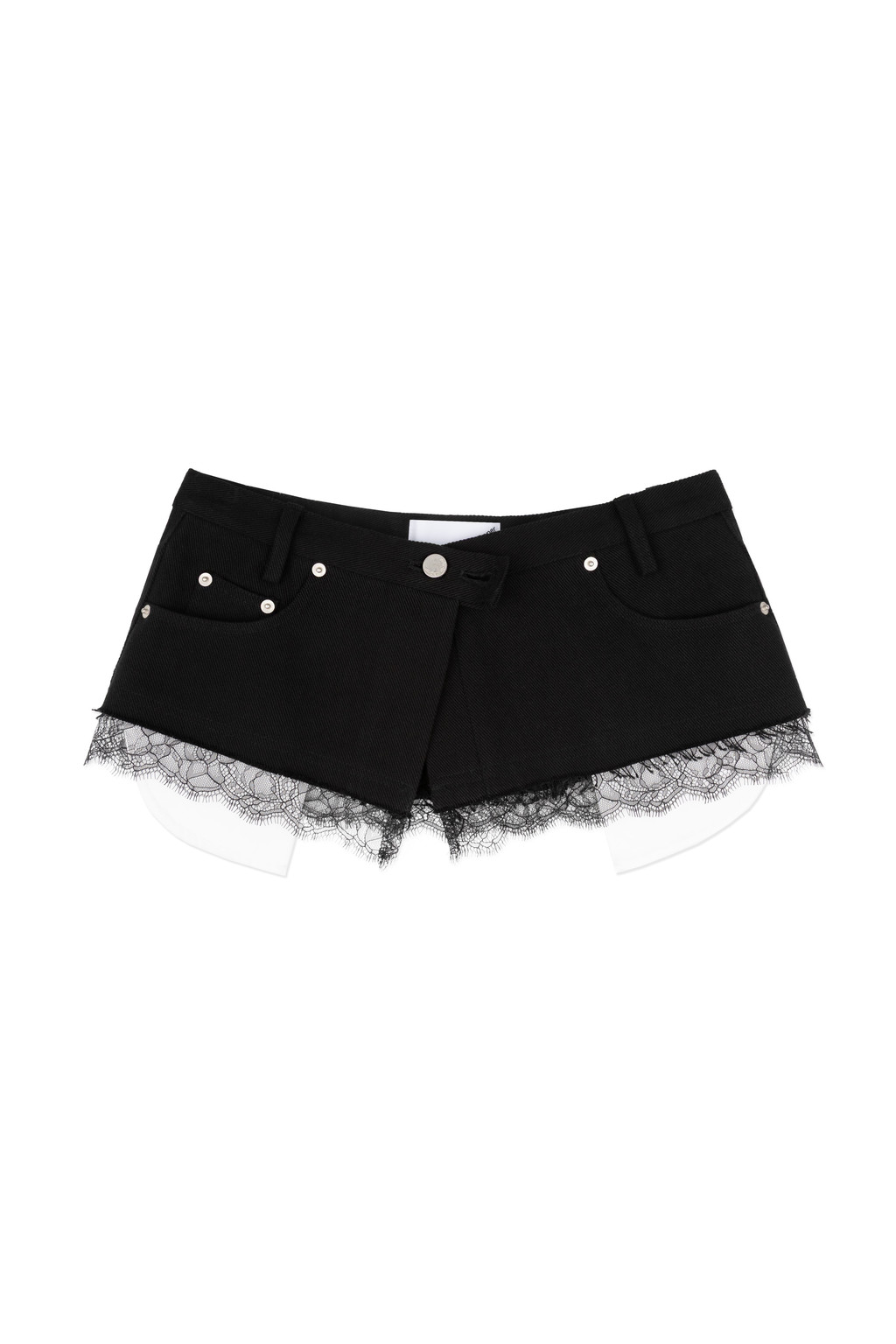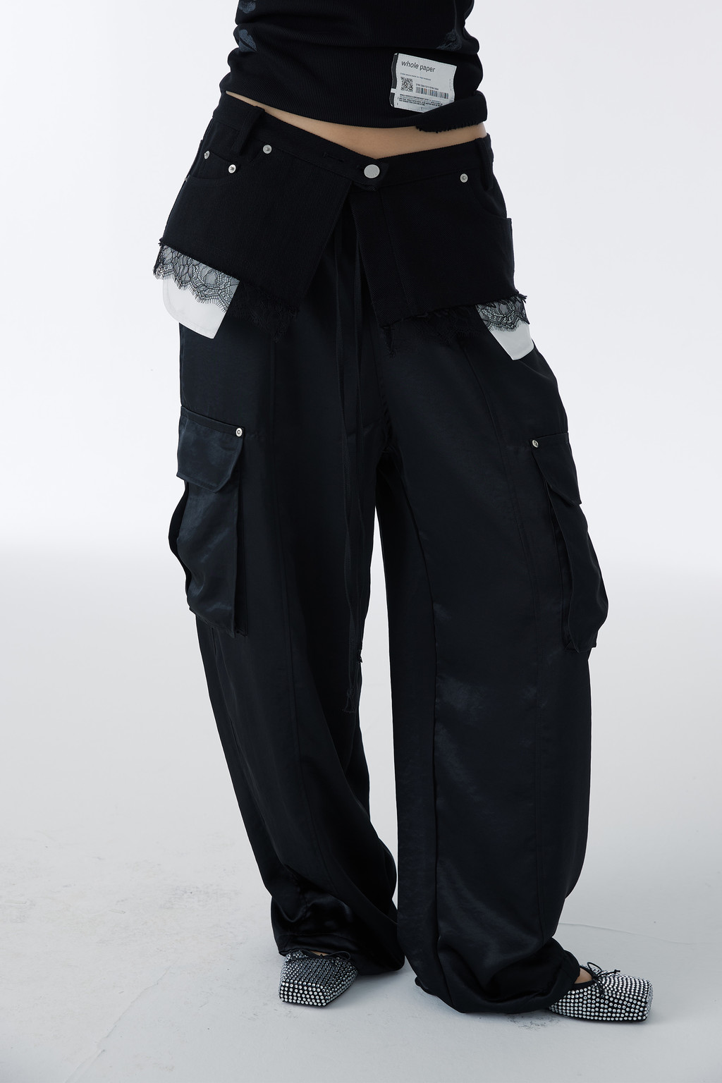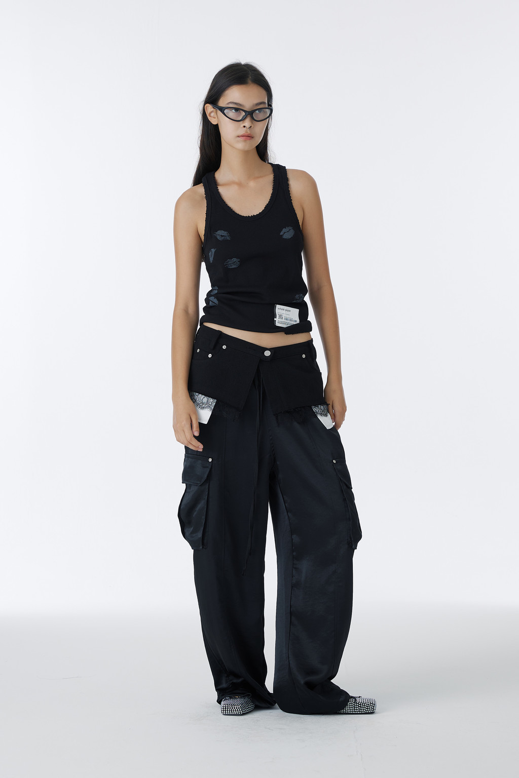 러프하게 컷아웃된 밑단에 레이스를 레이어드해 시크함과 러블리한 무드를 동시에 연출하며,