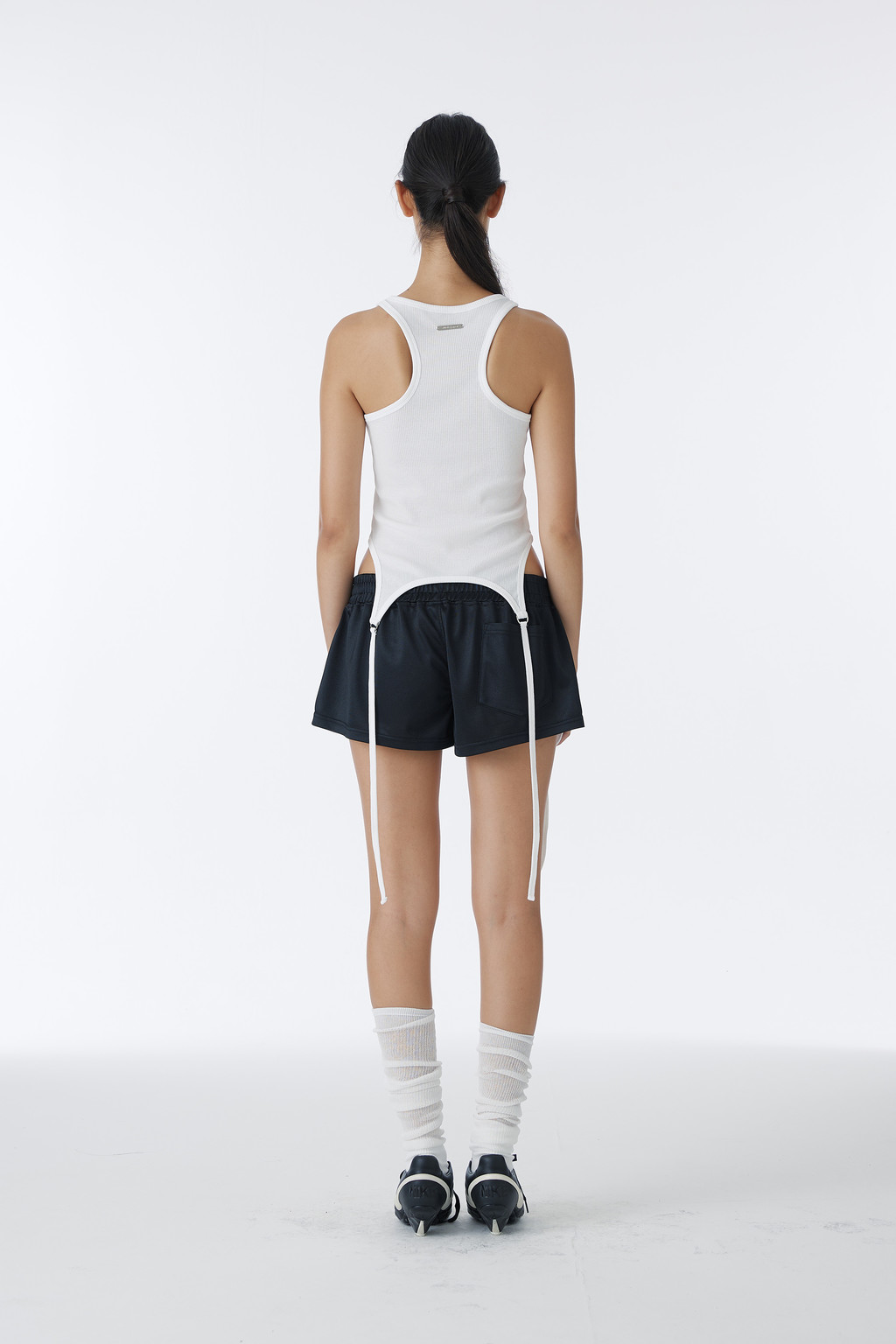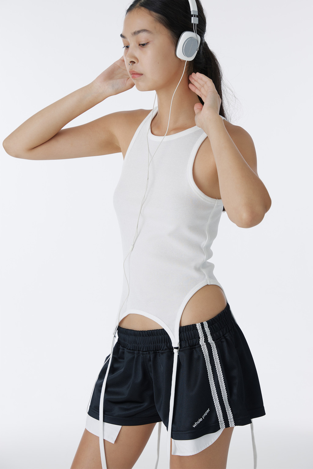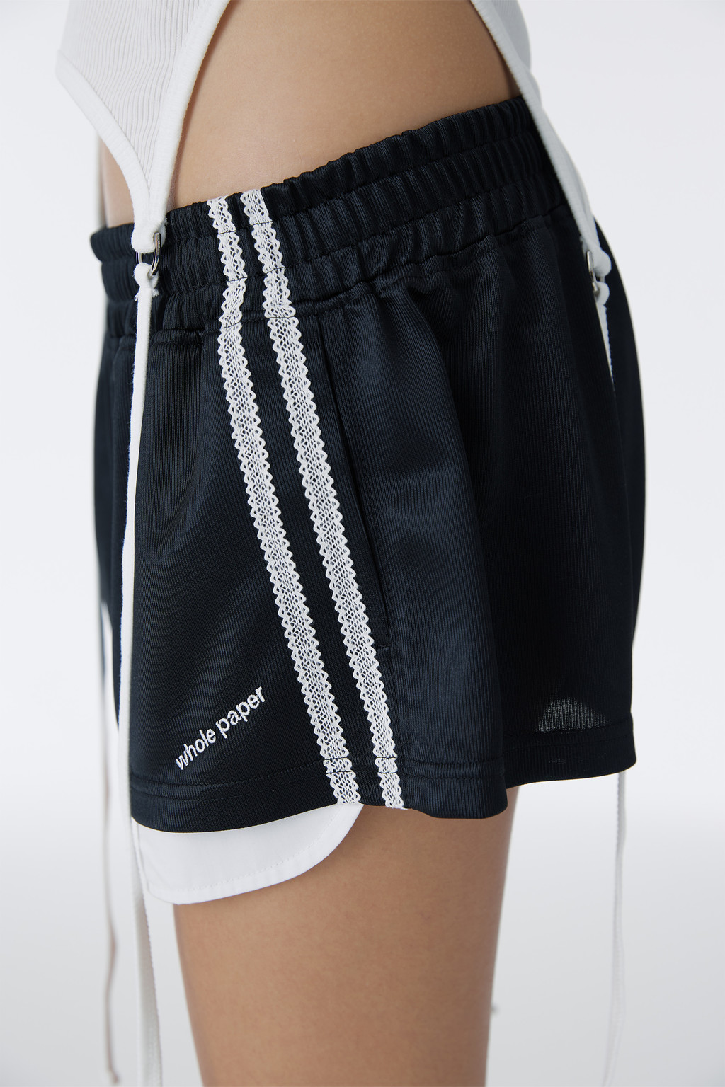 글로시한 광택이 도는 시원한 소재와 옆선의 레이스 테이프가 어우러져 스포티하면서도 러블리한 무드를 동시에 연출합니다.