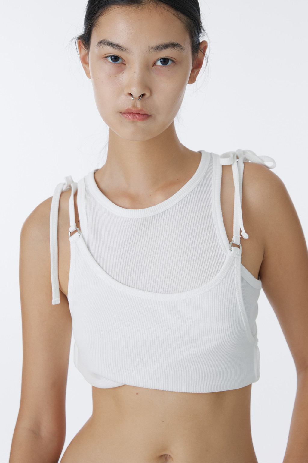 밑단에 D링과 스트링이 달려 투웨이로 착용할 수 있는 탑입니다.