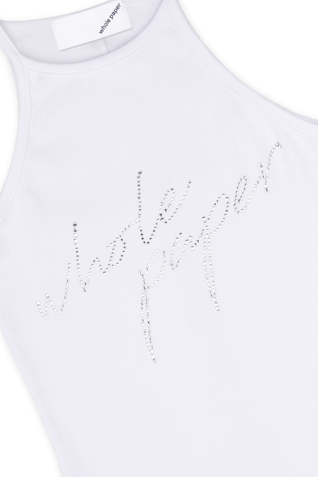 원단 컬러와 동일한 톤 온 톤 큐빅 로고 그래픽이 돋보이는 홀터넥 탱크탑입니다.