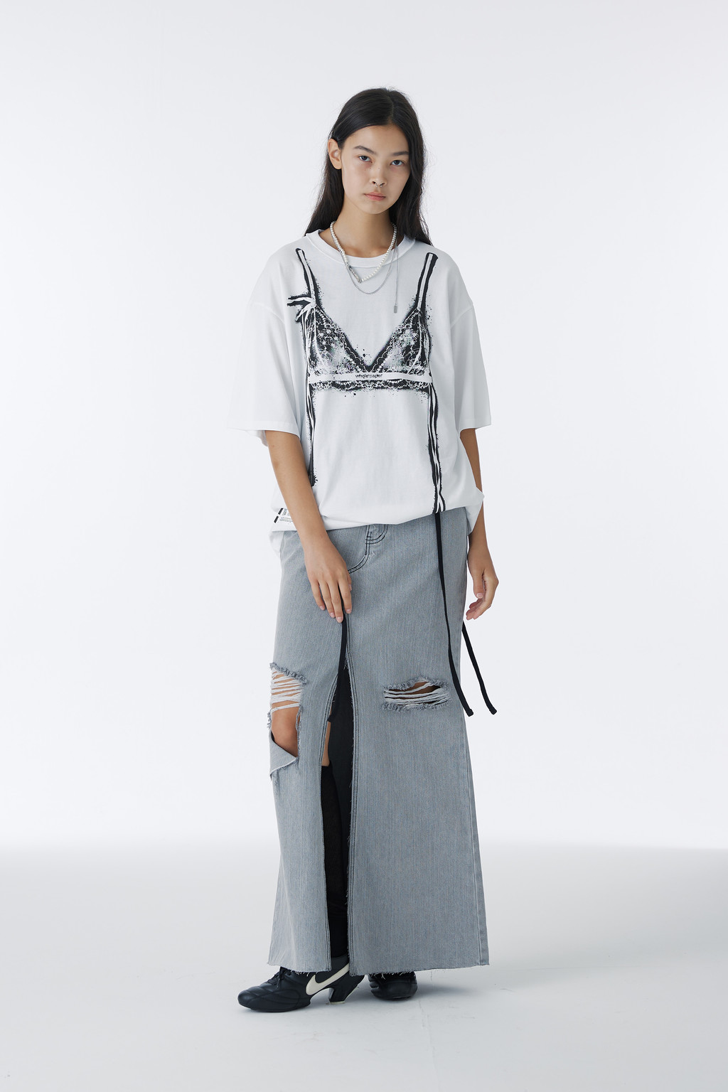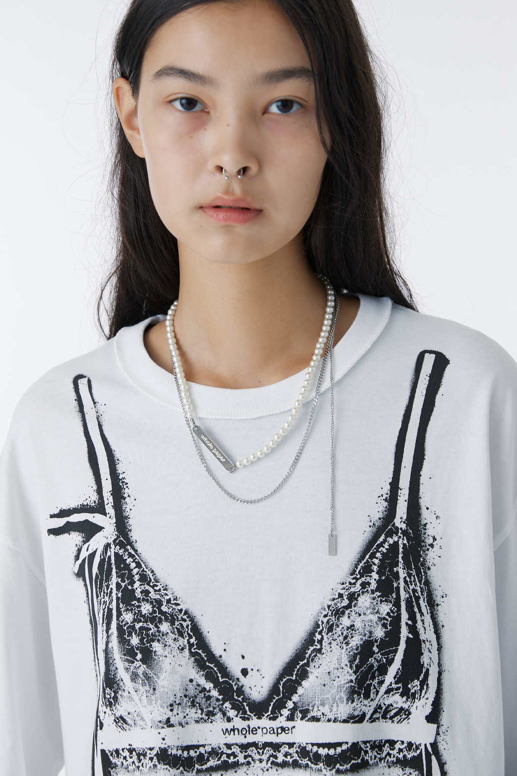 로고 금속 펜던트와 진주, 굵기다 다른 체인들을 믹스 매치해 스타일리시하면서도 캐주얼한 무드의 진주 네크리스를 완성했습니다.