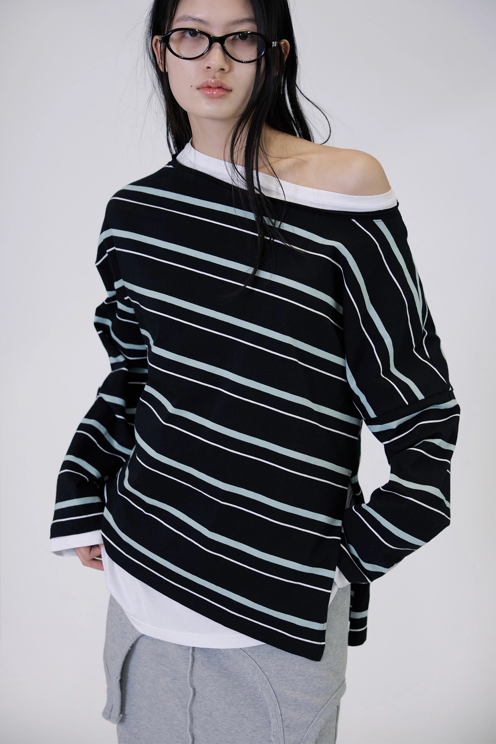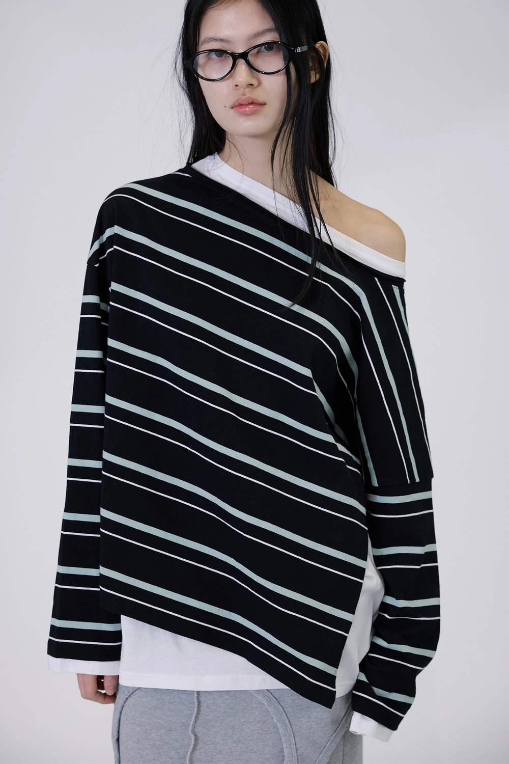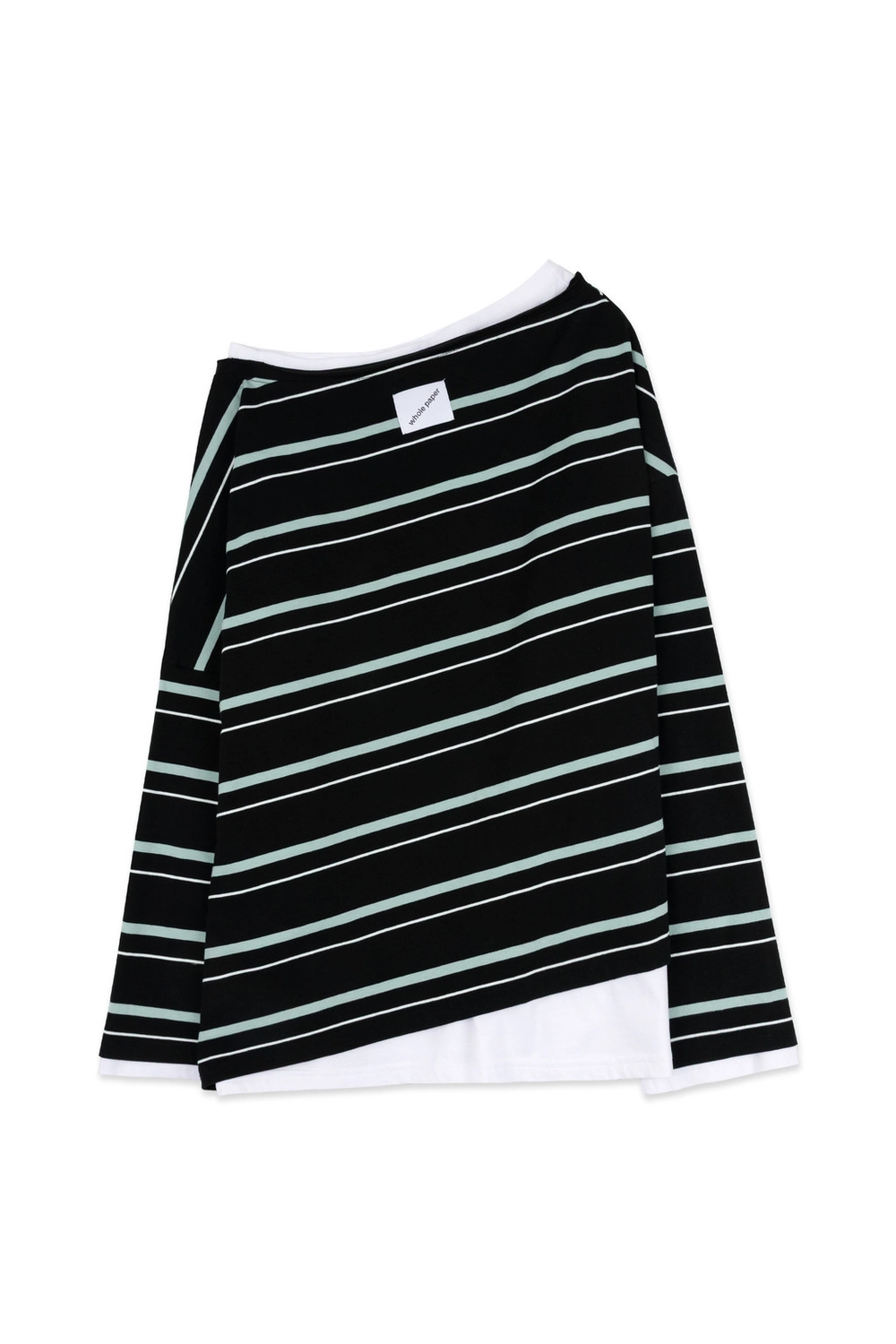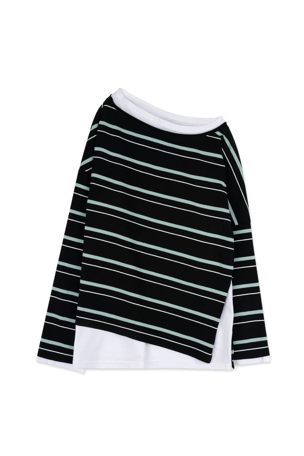 오프숄더 스트라이프 언발란스 레이어드 탑 (블랙)