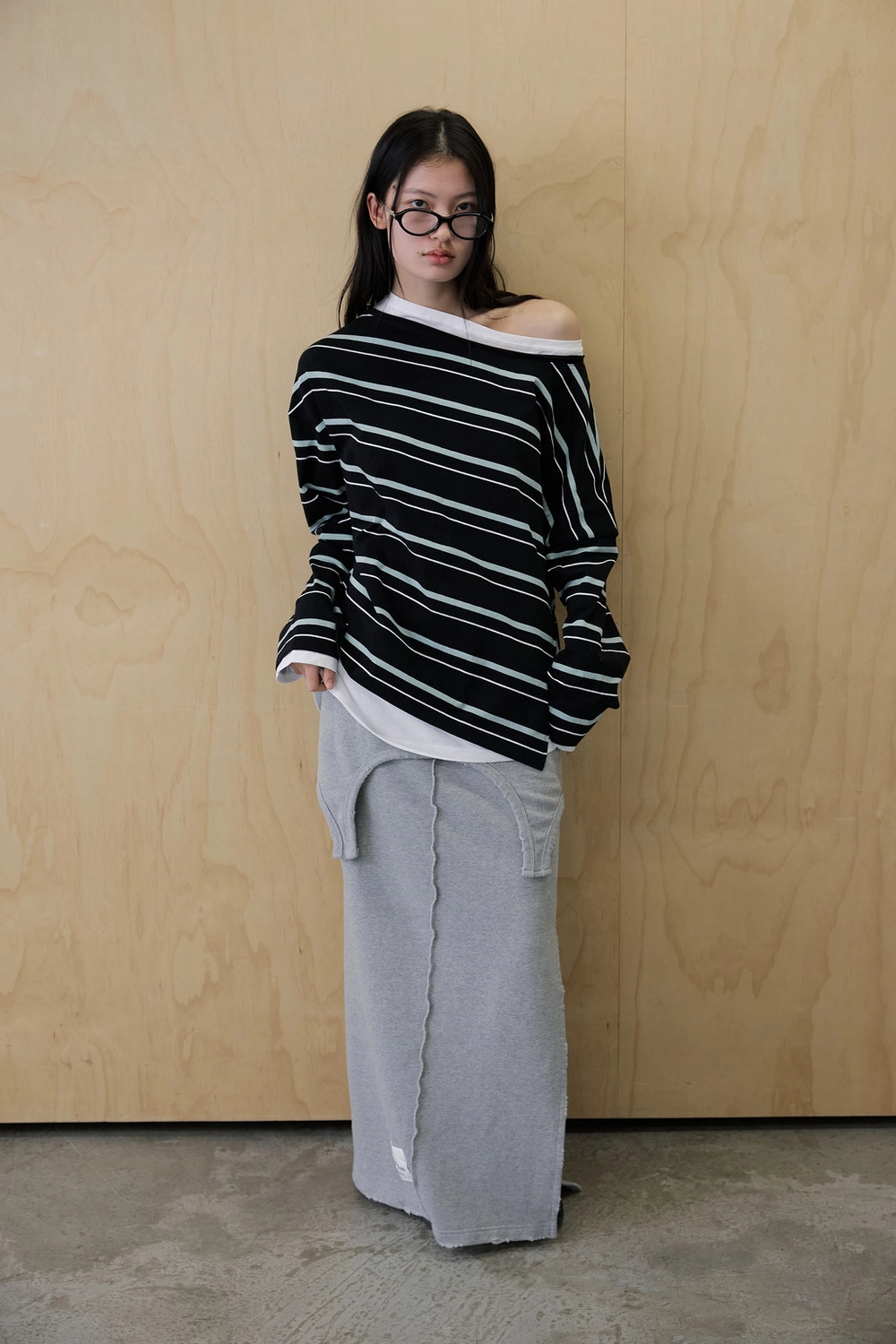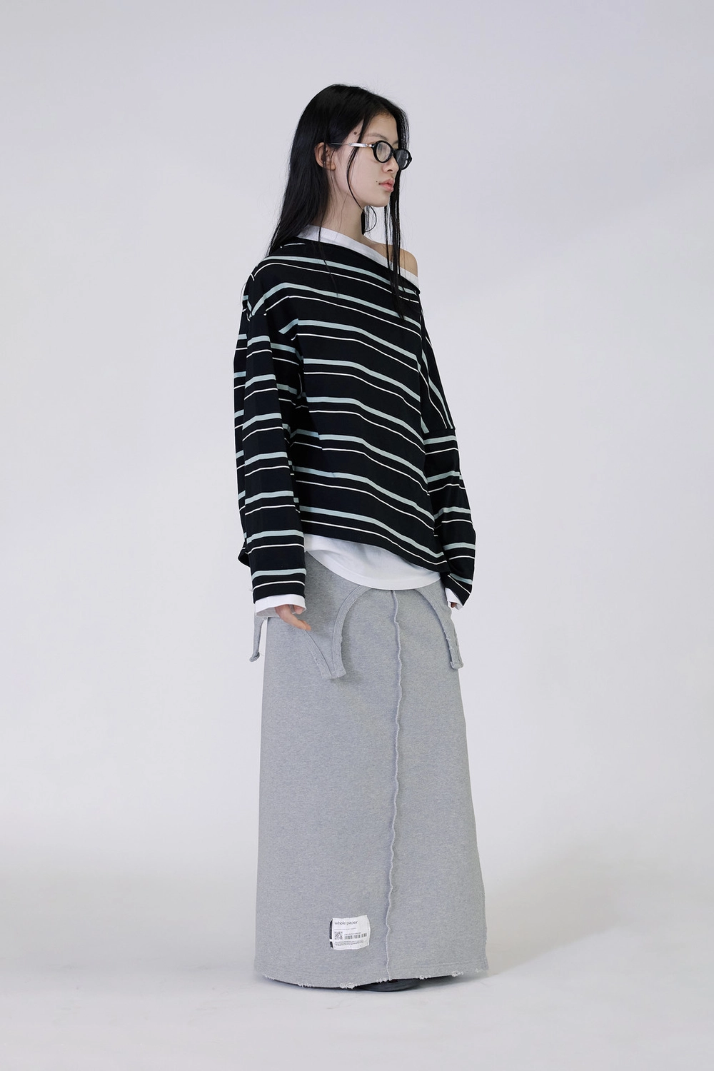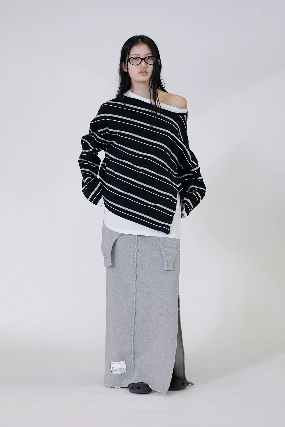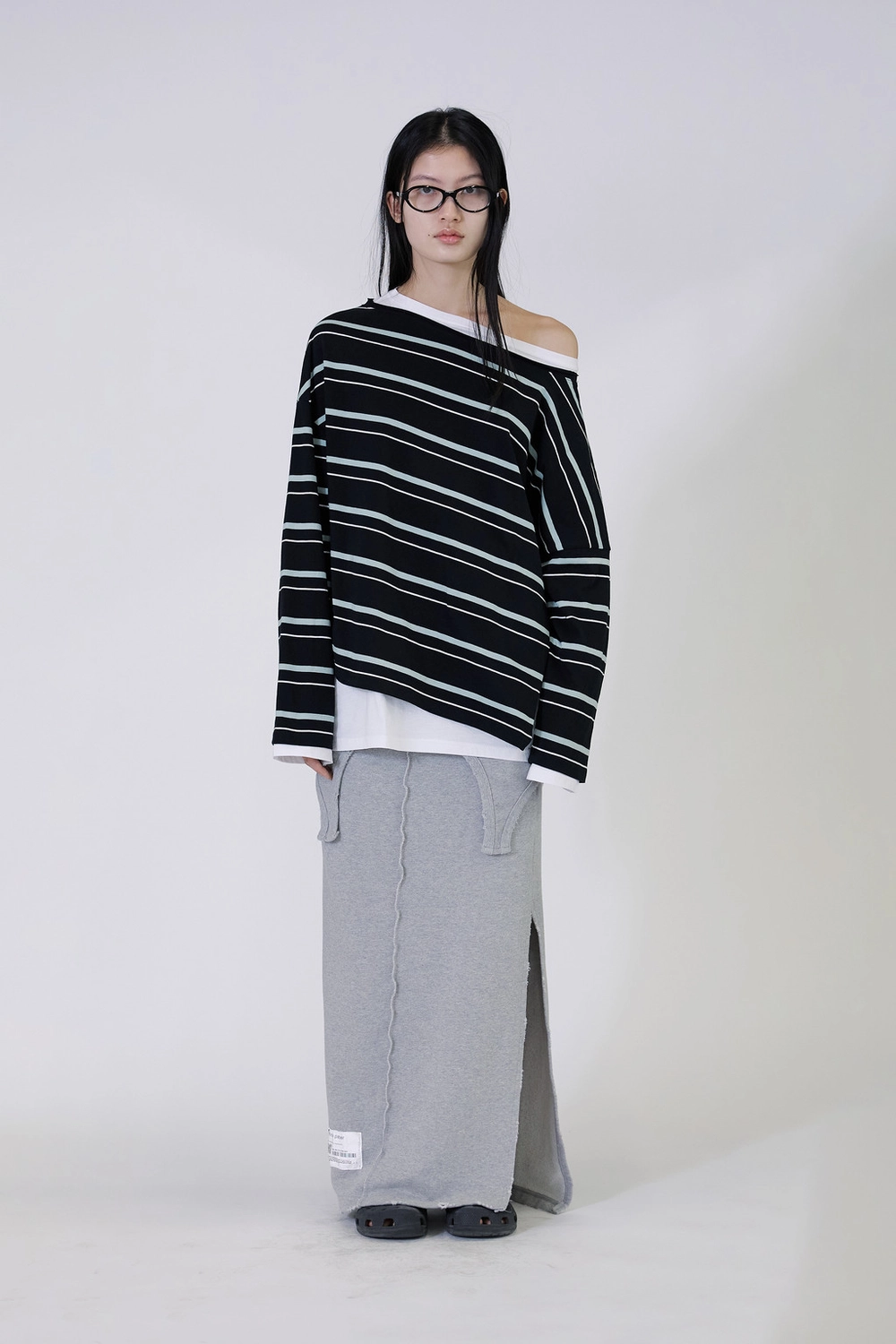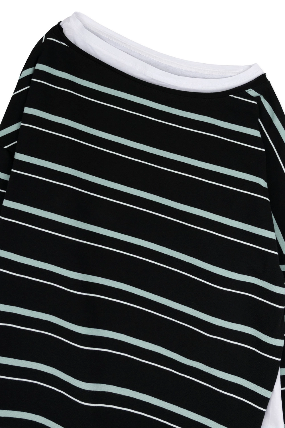 오프숄더 스트라이프 언발란스 레이어드 탑 (블랙)