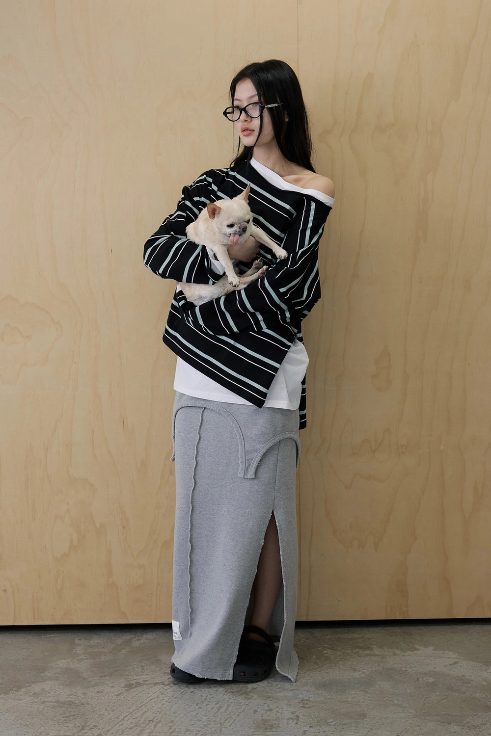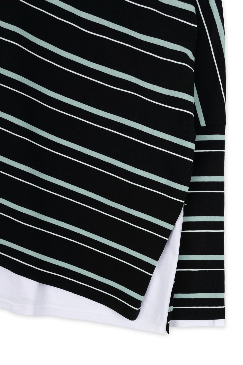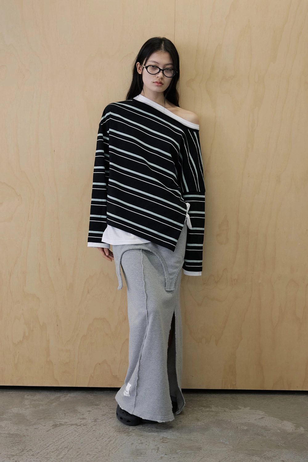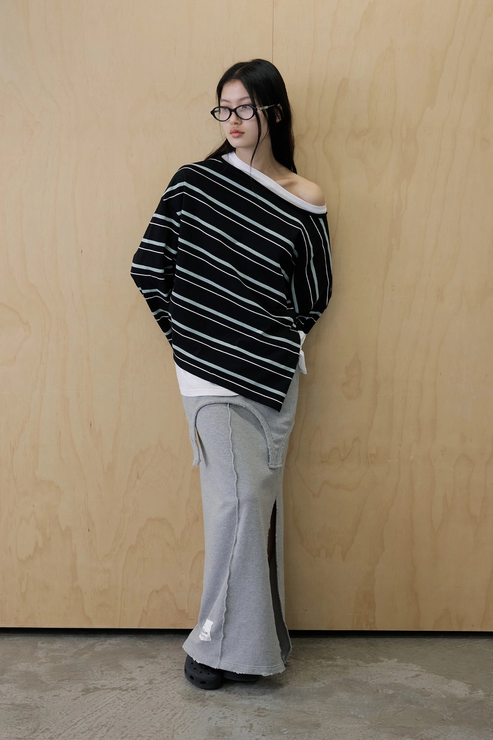 오프숄더 스트라이프 언발란스 레이어드 탑 (블랙)