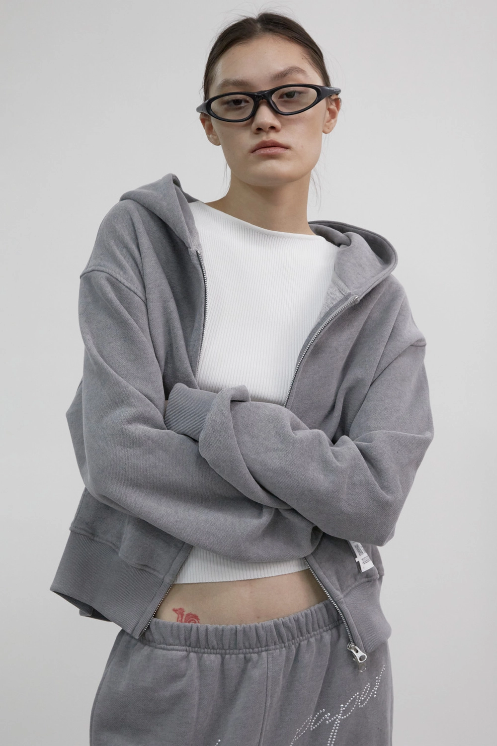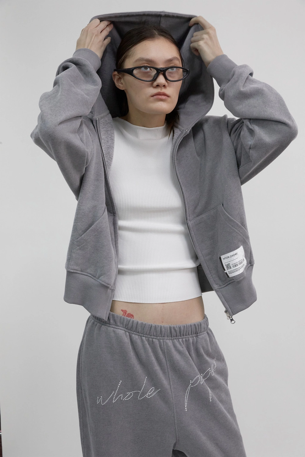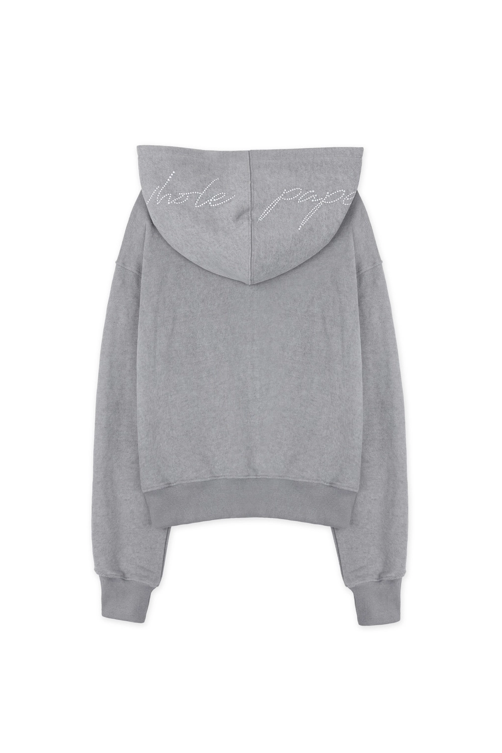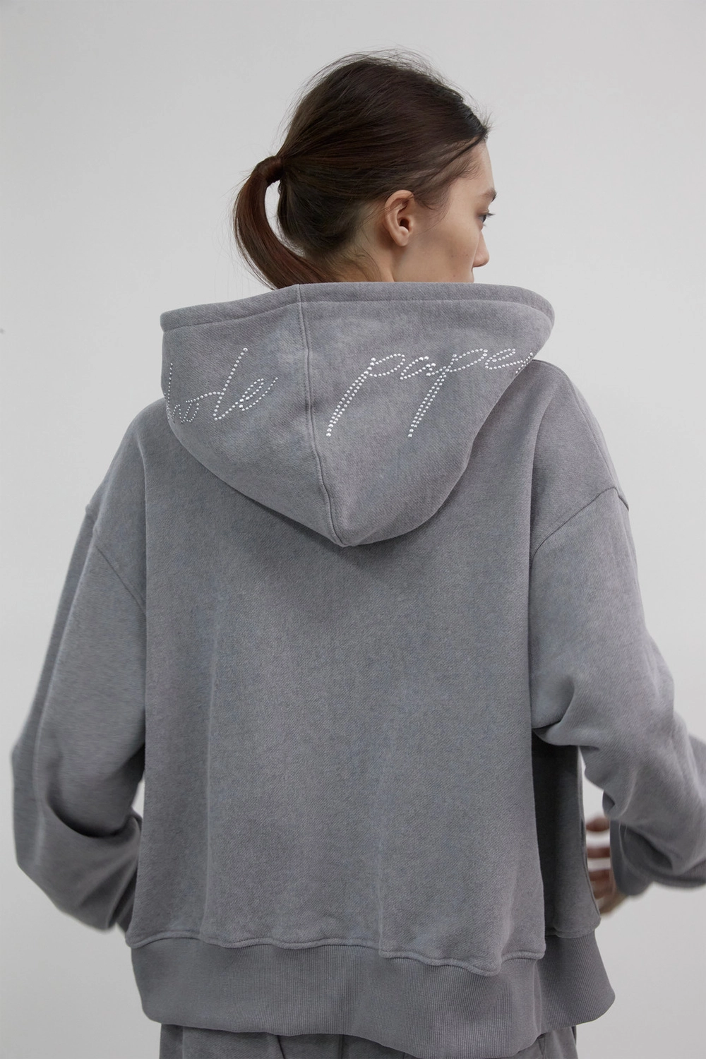 피그먼트 워싱이 된 면 100% 양면 기모 원단에 톤온톤 실버 큐빅 그래픽으로 부담스럽지 않은 포인트를 살린 후드집업입니다. 기모 후드지만 얇은 두께감으로 겨울철 아우터 속 이너로 활용하거나 간절기 단독 아우터로 착용하기 적합하며 넉넉한 후드 사이즈로 이너로 활용 시 큐빅이 특히 돋보이는 제품입니다. 페이퍼(타이백) 라벨로 포인트를 주었으며 YKK 투웨이 지퍼 활용성을 더했습니다.